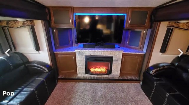 A living and entertainment area with a great TV and Fireplace, and to add to the room's beauty with blue lighting, two great couches open into beds. It also has a double lounge chair for laying back and watching TV.